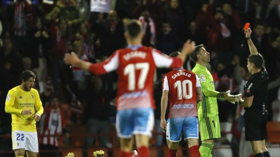 El guion deparó la jugada controvertida del encuentro a los 25 minutos con la expulsión del cancerbero del Cádiz, Alberto Cifuentes, por una entrada temeraria al extremo Gerard Valentín fuera del área. El árbitro revisó la acción por orden del VAR, anuló la falta por una mano previa del jugador del Lugo pero mantuvo la roja directa al portero.