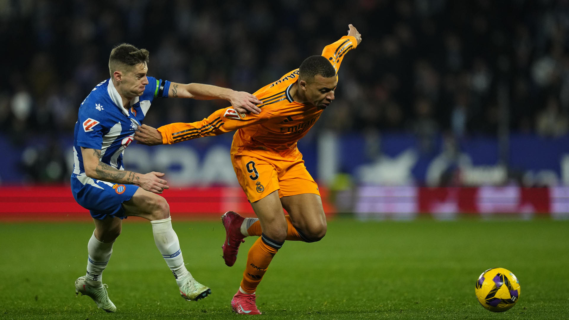 Joan García empezó a ser protagonista con una parada a bocajarro al francés, y la fortuna de que el poste completó su trabajo, y las ocasiones empezaron a multiplicarse en un Madrid que apretó sin puntería. Romero se jugó la roja parando a Mbappé con una dura entrada por detrás y al Espanyol le costó salir hacia la meta rival con el repliegue forzoso en su campo.