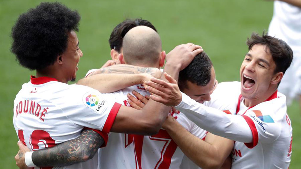 El inexistente penalti espoleó al Sevilla, que comenzó a generar más peligro sobre el área armera. En el minuto 26 nuevamente Es-Nesyri cayó dentro del área por una entrada de Bigas. En esta ocasión sucedió al revés, primero no pitó penalti el colegiado, pero tras revisar la jugada por el VAR optó por concederlo. Lo lanzó en el minuto 27 Marcos Ocampos engañando a Dmtrovic y logrando así el primer gol para el Sevilla.