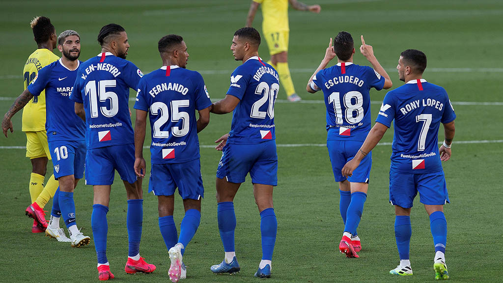 Tan solo las subidas de Jules Koundé por la banda derecha crearon cierta inquietud en el Villarreal. Poco antes del descanso Escudero recibió un balón más allá de la frontal, no salió nadie a marcarle, por lo que el lateral se acomodó a placer y soltó un colocado disparo para empatar el encuentro y acabar con la imbatibilidad del Villarreal desde que se reanudó el campeonato. Sin embargo en la última acción del primer tiempo, un saque de esquina de Cazorla lo cabeceó cómodamente el central Pau Torres para dar ventaja a los suyos.