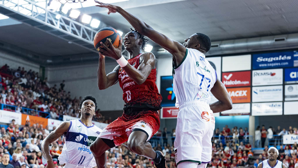 Cuando el Unicaja intentó rebajar la gran ventaja de los locales, estos hicieron una de las mejores jugadas del partido con un tapón espectacular de Musa Sagnia y un posterior triple en el contraataque de Travante Williams (41-22, min. 19).