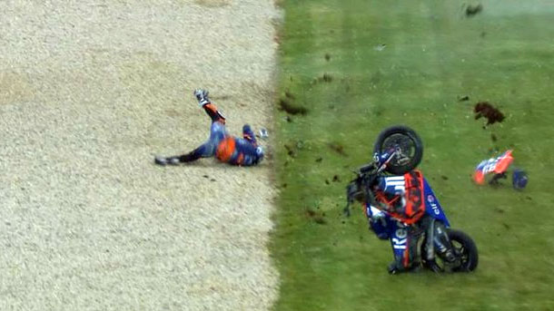 En los cuartos entrenamientos libres, en los que todos los pilotos preparan la clasificación y hasta la estrategia de carrera, el portugués Miguel Oliveira (KTM RC 16) sufrió una espectacular y fuerte caída en la rapidísima curva uno de final de recta, empujado por el viento, que le dejó tendido en la hierba.