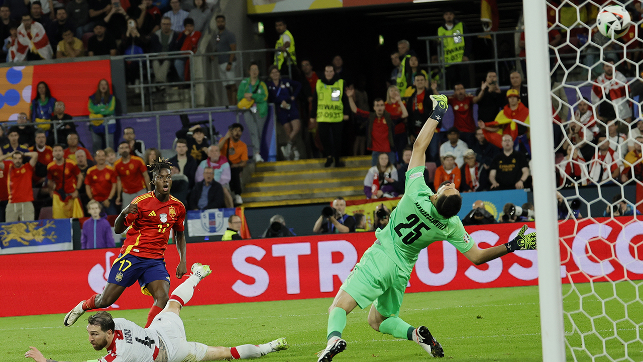 Tan sencillo y a la vez tan complejo de controlar porque lo sufrió por momentos una España dominante que abrumó a su rival sin aburrir con posesión improductiva. Con ritmo y directa. Desbordando con Nico Williams y encarando con Lamine Yamal, que la pide, encara y pisa la pelota como en el barrio pero en unos octavos de final de Eurocopa. Cuatro córners y diez llegadas a área rival en once minutos. Dos paradas de mérito del mejor portero del torneo, Mamardashvili. Abajo al remate de Pedri, frenando la intuición en el testarazo tras córner de Carvajal.