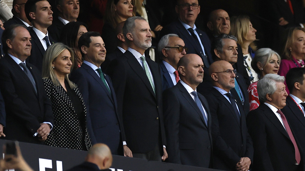 En el palco, el Rey Felipe VI, que entregó el trofeo a los donostiarras, acompañado por el presidente de la Junta, Juanma Moreno.