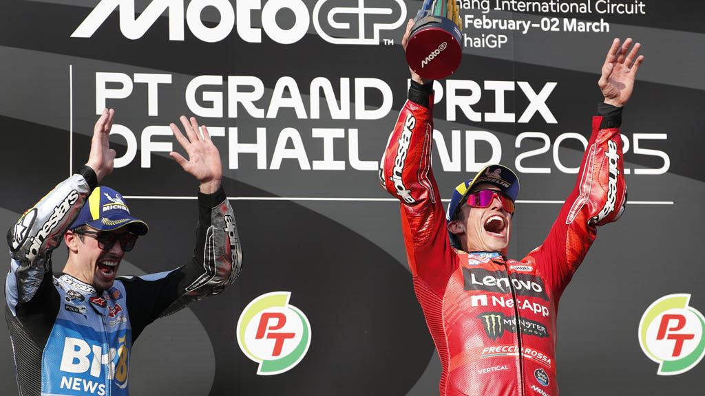 Marc Márquez (Ducati Desmosedici GP25), Manuel González (Kalex) y José Antonio Rueda (KTM) han protagonizado un nuevo pleno de victorias españolas, el cuadragésimo primero, al vencer en sus respectivas categorías del Gran Premio de Tailandia que se disputó en el circuito 'Chang Internacional' de Buriram.