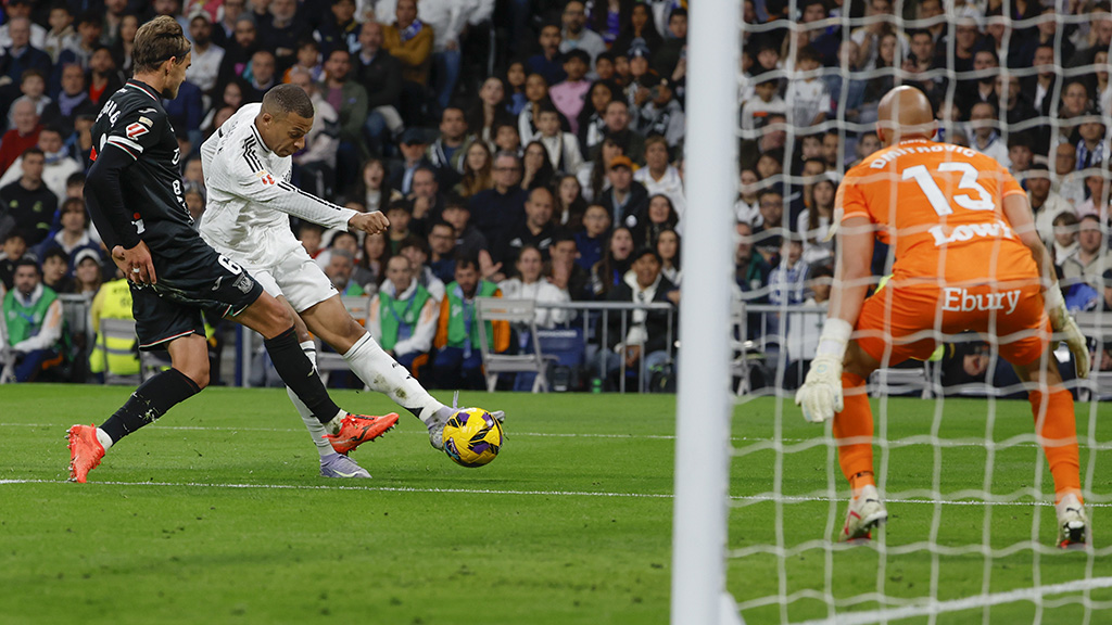 Las ocasiones locales empezaron a ser serias cuando Mbappé fusiló a metro y medio a Marko Dmitrovic sin marcar, cerca de la media hora. El central y capitán del 'Lega', Sergio González, se multiplicó tapando disparos blancos y su portero cumplió también, hasta que llegó un riguroso penalti, de àscar sobre Arda Güler, que vio claro González Fuertes y dio sin duda la mejor opción de gol.