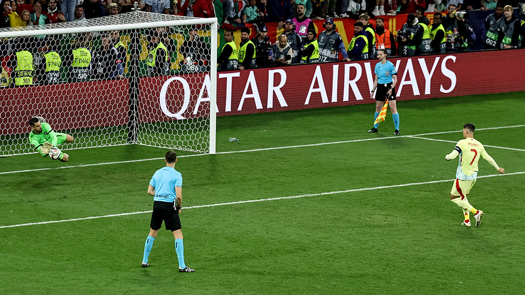 La primera de la prórroga, con centro de Nuno Mendes, la perdonaba Semedo con todo para marcar. Un detalle decidiría la final. Cucurella chutaba arriba de zurda, Lamine Yamal buscaba sin éxito su momento con un disparo centrado y Pedro Porro, desde el centro del campo, buscaba el factor sorpresa. Nada volvería a tumbar a Portugal, que tuvo la última en un cabezazo de Diego Jota, y fue infalible en la tanda de penaltis. Marcó todos sus lanzamientos, como España hasta que a Morata le aparecieron los fantasmas del pasado.