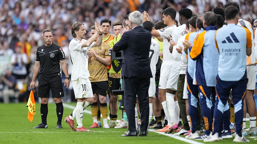 Poco fútbol y mucha emoción en el Santiago Bernabéu en la última jornada de Liga. Sin nada en juego, el balón pasó a un segundo plano, en el día en el que dos leyendas como Modric y Ancelotti, jugador y entrenador más laureados de la historia del club, se despedían del feudo madridista. Dos grandes tifos que rezaban 'Gracias, Leyenda', y 'Gracias, Carletto' recibieron al equipo en la previa de un partido que se rompió con el cambio del croata ante un estadio en pie.