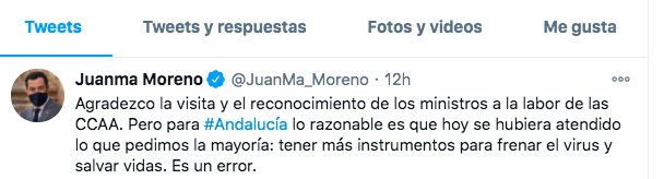 El presidente de la Junta, Juanma Moreno, ha dicho en un Twit que le parece un error que el Ministerio no acepte las peticiones de las comunidades
