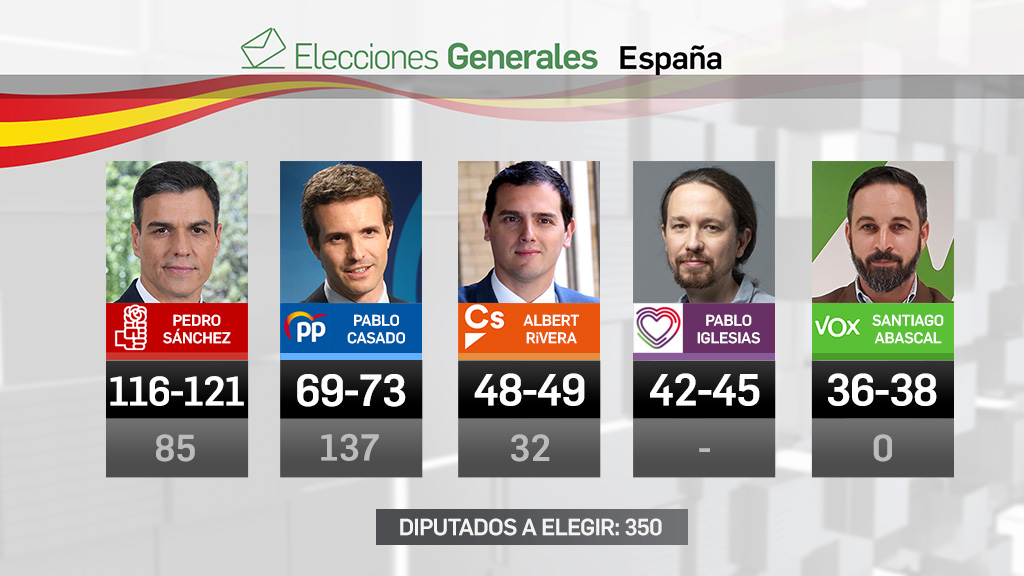 El Partido Socialista habría ganado las elecciones generales de este domingo por una amplia mayoría aunque requiere necesariamente de futuros pactos para gobernar, ya que obtendría entre 116 y 121 escaños según el sondeo de GAD 3 para Canal Sur. Eso supone mejorar en mucho el resultado de 2016 cuando obtuvo 85 escaños, el peor resultado de su historia.