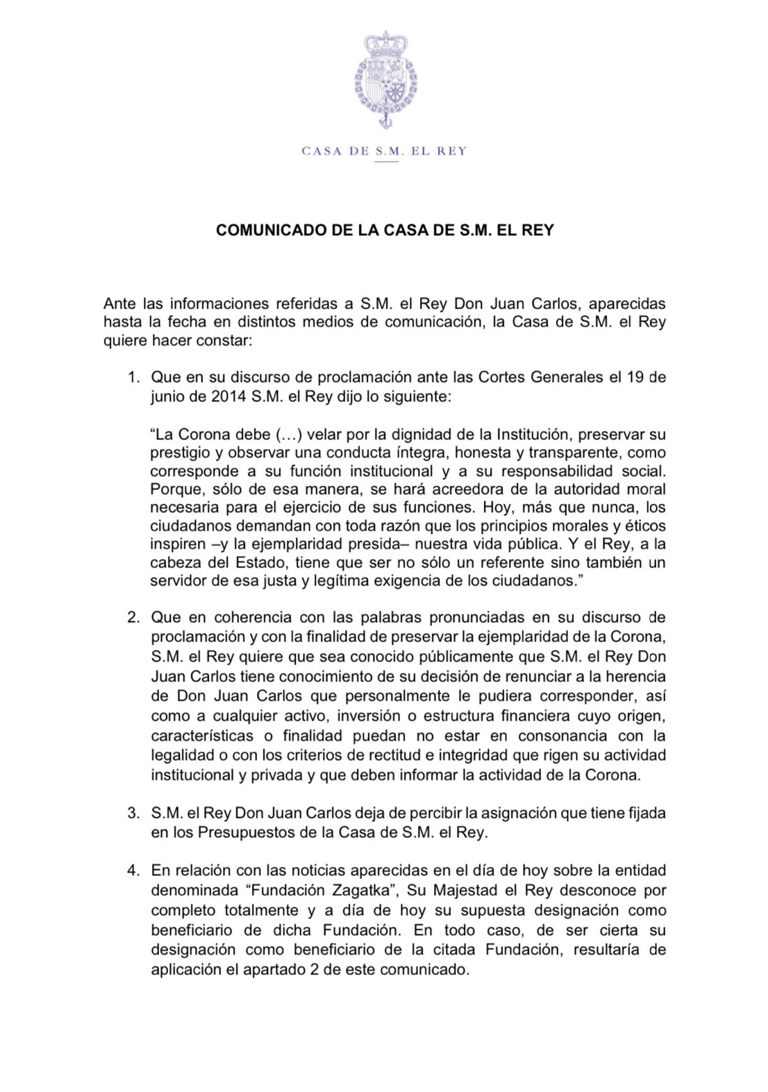 Ante esas informaciones, la Casa Real recuerda las palabras del rey en su discurso de proclamación del 19 de junio de 2014 en las que dijo que la Corona debe velar por la dignidad de la institución, preservar su prestigio y observar una conducta íntegra, honesta y transparente, como corresponde a su función institucional y a su responsabilidad social.