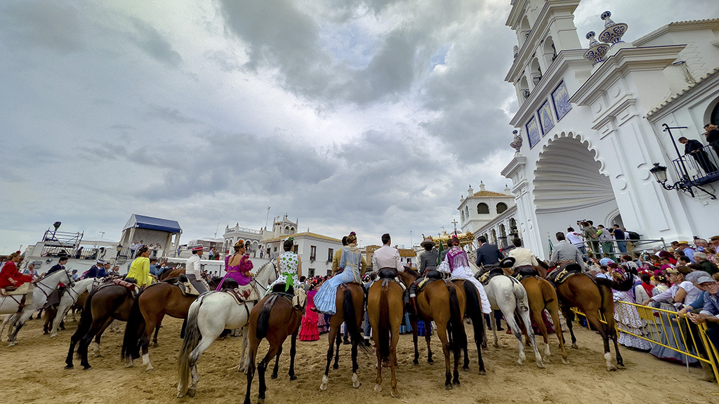 Miles de peregrinos llenan ya las calles de El Rocío en una jornada de sábado que amenaza lluvia. Muchos llegan en autobús. Se han reforzado las líneas entre Sevilla y Huelva hacia la aldea