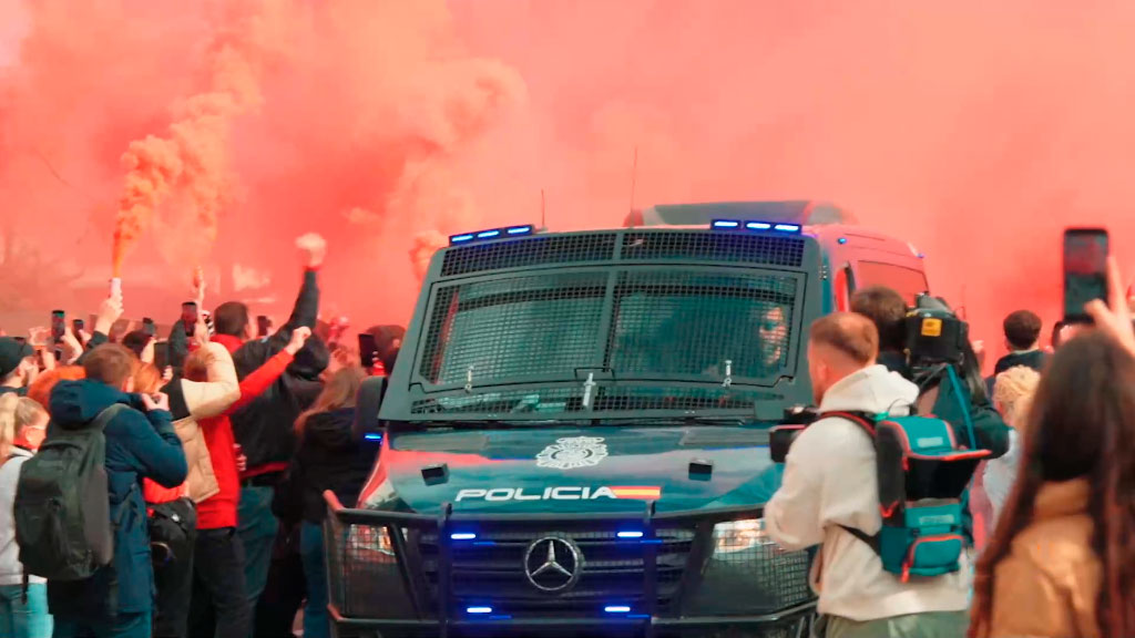 La presentadora del programa, Cruz Morcillo, acompaña al operativo policial de la UIP desplegado para el derbi de la capital hispalense, compuesto por unos 400 agentes.
