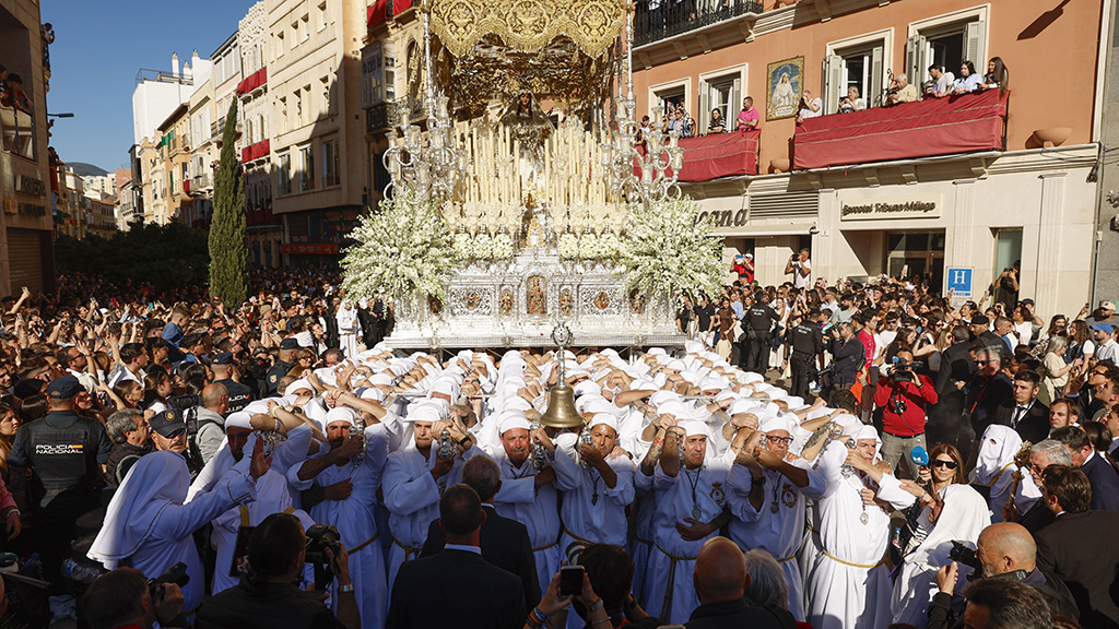 El barrio de la Victoria de Málaga vive  su día grande con la procesión de la Virgen del Rocío, la Novia de Málaga. En el oratorio de Santa María Reina y Madre los fieles contemplan de cerca el manto de flores de la Virgen de las Penas antes de que la dolorosa salga a la calle.