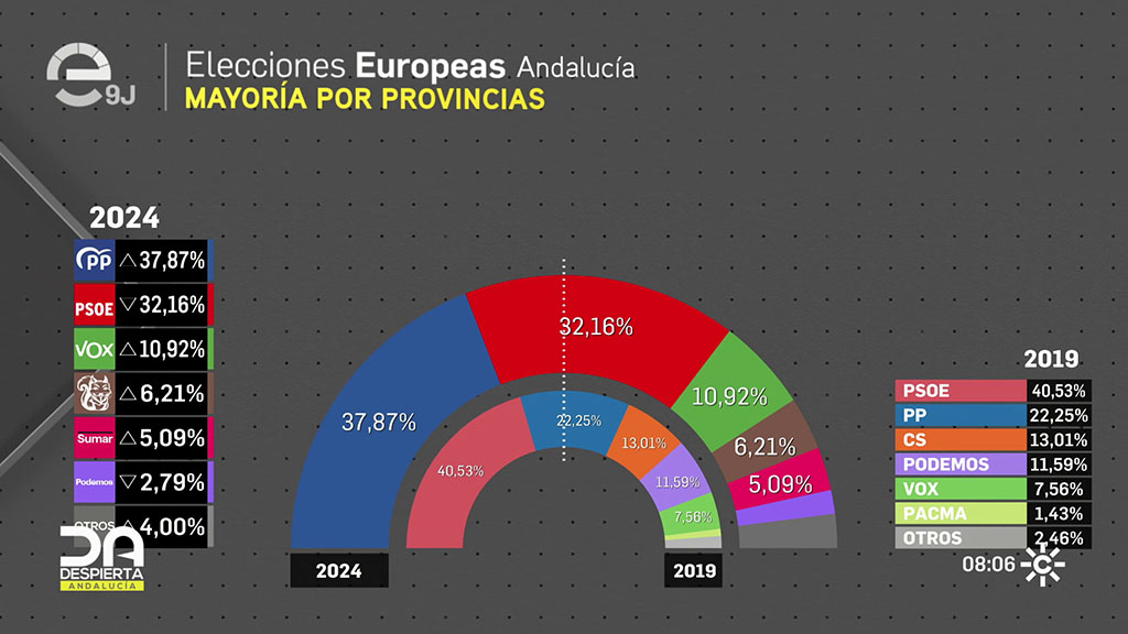 En Andalucía el PP es la formación política más votada, que ha juntado un total de 1.101.000 papeletas, casi 300.000 votos más que hace cinco años y lo que supone más de un 37% del total de la población con derecho a voto de la región, superando al PSOE en 5,7 puntos. El PSOE, que pierde por primera vez las europeas en Andalucía, es la segunda fuerza política, con más de 934.000 votos. Con el 32 por ciento de los votos, ha perdido ocho puntos respecto a 2019. Su líder regional, Juan Espadas, no logra romper el ciclo ganador de Moreno justo cuando se cumple el ecuador de la legislatura autonómica.