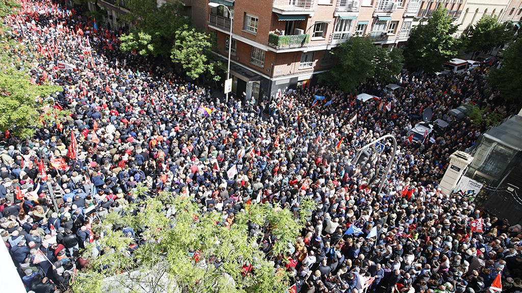 Militantes y simpatizantes del PSOE han ocupado este sábado por la mañana la calle Ferraz de Madrid. Desde poco después de las 9.00 horas han ido llegando los primeros manifestantes que se han colocado en la acera frente a la sede, muchos de ellos procedentes de otros puntos del país. De hecho, se han desplazado de madrugada en autobuses movilizados por las federaciones autonómicas del PSOE, con el objetivo de buscar una movilización masiva sin precedentes junto a la sede nacional.