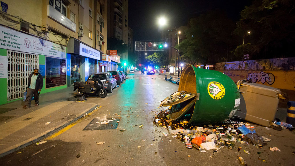 En Málaga todo empezó tras una concentración cuando algunos manifestantes empezaron a arrojar botellas de vidrio a los agentes de policía, cortaron algunas calles de la zona, volcando contenedores. Los vecinos de Huelin han condenado de forma unánime los incidentes de anoche.