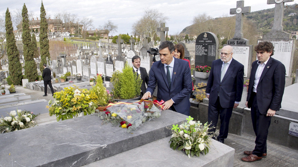 El presidente del Gobierno deposita un ramo de flores sobre su tumba en el cementerio de Polloe de San Sebastián.