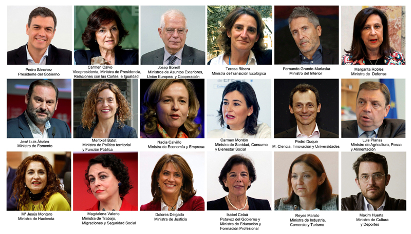 El Gobierno de España tendrá once ministras y seis ministros. En el ejecutivo estarán las ministras andaluzas Carmen Calvo (Vicepresidenta) y María Jesús Montero (Hacienda),. Isabel Celaá será Ministra de Educación y portavoz del Gobierno. Los nuevos ministros y ministras prometerán su cargo ante el Rey a las diez de la mañana de este jueves,