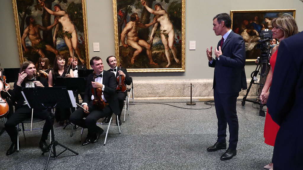 Antes de acceder al claustro del museo, donde se ha celebrado la cena, los líderes han visitado otras dependencias de la pinacoteca y han tenido oportunidad de visitar la sala dedicada a Velázquez y contemplar de forma especial "Las Meninas". Junto a ese cuadro ha habido una foto de familia de los jefes de Estado y de Gobierno, primero solos y después junto a sus acompañantes, y todos ellos, a su finalización, han prorrumpido en un aplauso.