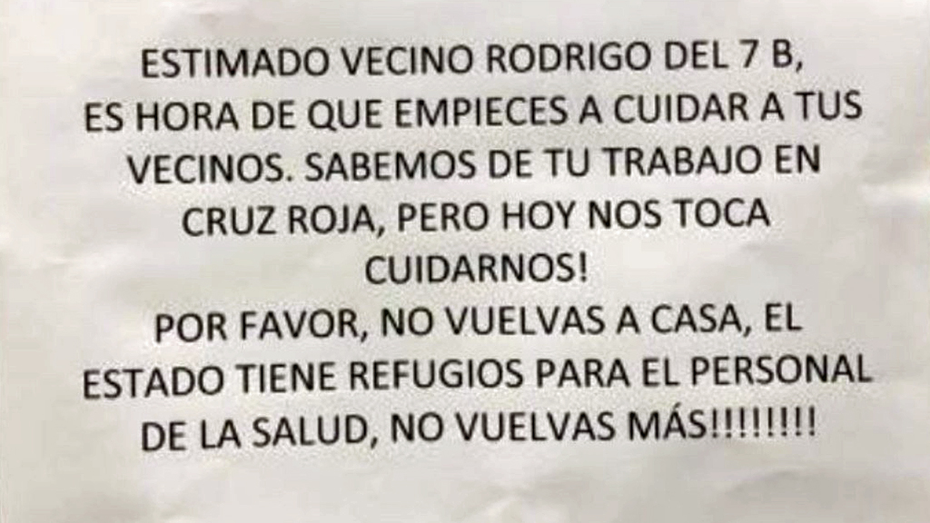 Esta falta de solidaridad la encontramos también en otros lugares del planeta. Por ejemplo, de Argentina, nos llegan dos notas. La primera estaba pegada en el espejo del ascensor. La víctima es Rodrigo, director de Emergencias de Cruz Roja.