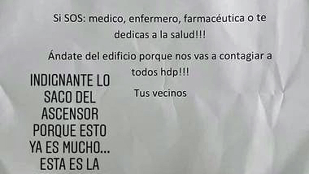 Miriam, desde Cartagena, cuenta que, hace unos días, su hijo, de diez años, se encontró con una nota, sin firmar. En ella, sus vecinos le piden que se marche de su casa por trabajar en un supermercado, ya que no quieren "más riesgos".