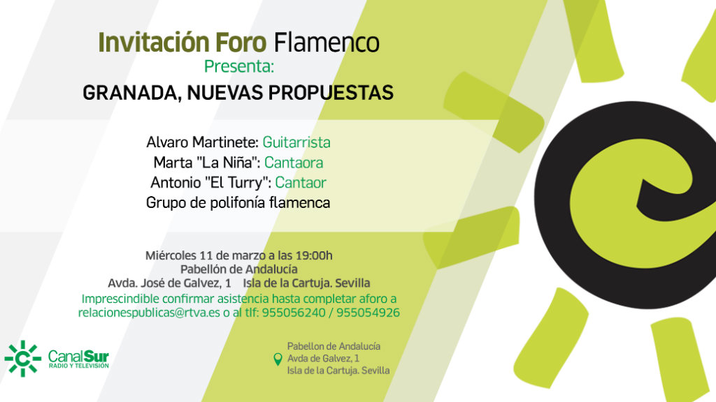 "Granada, nuevas propuestas flamencas" es el título de la edición de marzo del "Foro Flamenco" que organizan Canal Sur Radio y FlamencoRadio.com y que se ha celebrado este miércoles 11 de marzo en la sala circular de la sede central de RTVA en Sevilla. Han actuado el guitarrista Álvaro Martinete, la cantaora Marta "La Niña", el cantaor Antonio "El Turry" y el Grupo de Polifonía Flamenca.