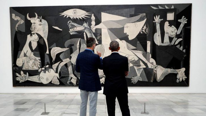 El rey ha acompañado al expresidente de EEUU Barack Obama en una visita privada al Museo Reina Sofía durante la que se han detenido especialmente ante el "Guernica" de Pablo Picasso y ante una selección de las obras de Salvador Dalí.