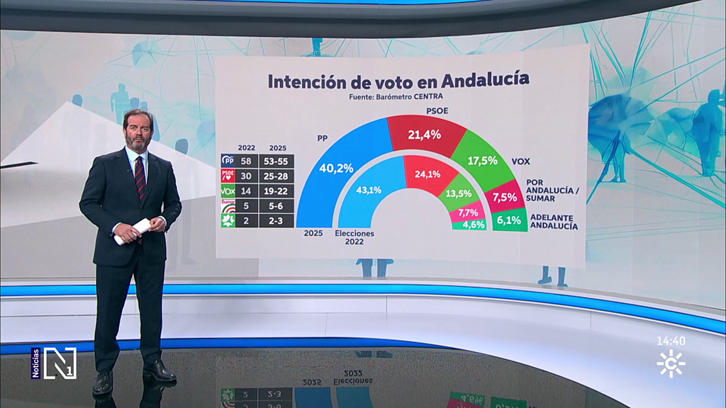 El barómetro de noviembre recoge que bajan PP (obtendría el 40,2 % de los votos) y PSOE (con el 21,4 %, casi la mitad que el PP), mientras que Vox se situaría como la tercera fuerza, con el 17,5 %. El cuarto lugar lo ocuparía Por Andalucía/Sumar, con el 7,5 % de los votos.