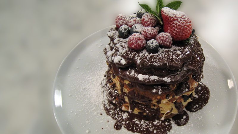 Apartar en un cuenco y mezclar con el queso crema. Engrasar una sartén y disponer un poco de masa de tortitas en el centro. Cocinar, a fuego medio, hasta que salgan pompitas por toda la superficie. Dar la vuelta, cocinar unos segundos y apartar. Por otro lado, derretir la cobertura de chocolate al baño María. Finalmente, montar el pastel colocando sobre una tortita un poco de masa de galletas y queso y unas fresas picadas. Encima colocar otra tortita y más relleno. Repetir este proceso hasta formar varias capas.