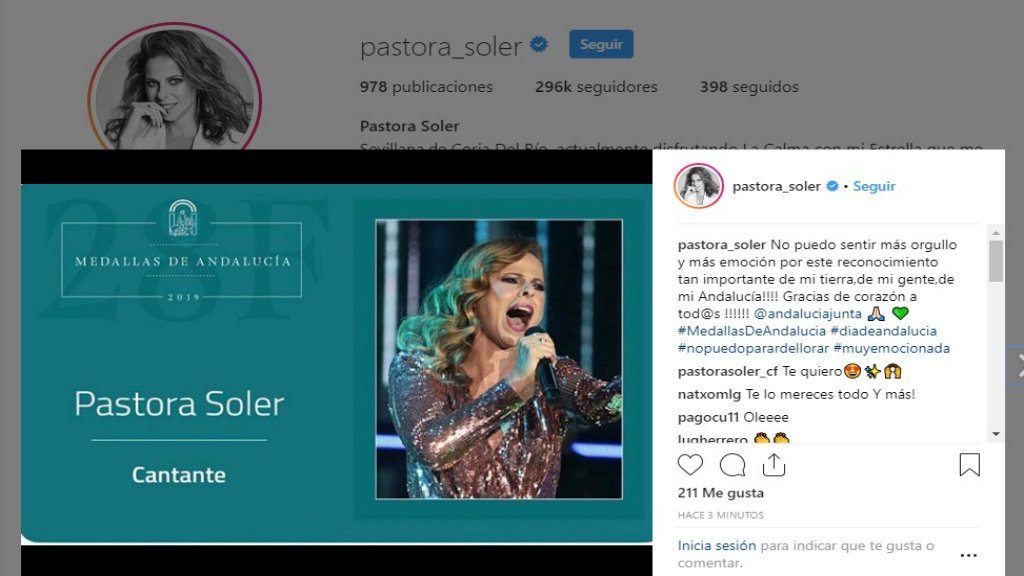 "No puedo sentir más orgullo y más emoción por este reconicimiento tanimportante de mi tierra, de mi gente, de mi Andalucía. Gracias de corazón a todos". Éstas han sido las palabras de Pastora Soler al conocer que este año recibirá la medalla de Andalucía.