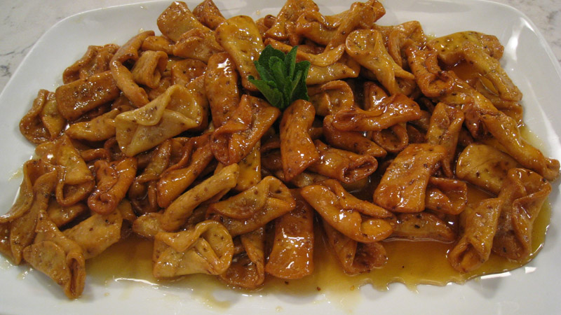 Finalmente, freír los pestiños en una sartén con aceite de oliva virgen extra, a fuego medio, para que cocinen por dentro y por fuera. Escurrir y sumergir durante unos 10 segundos en la miel. Sacar entonces y disponer en una fuente.