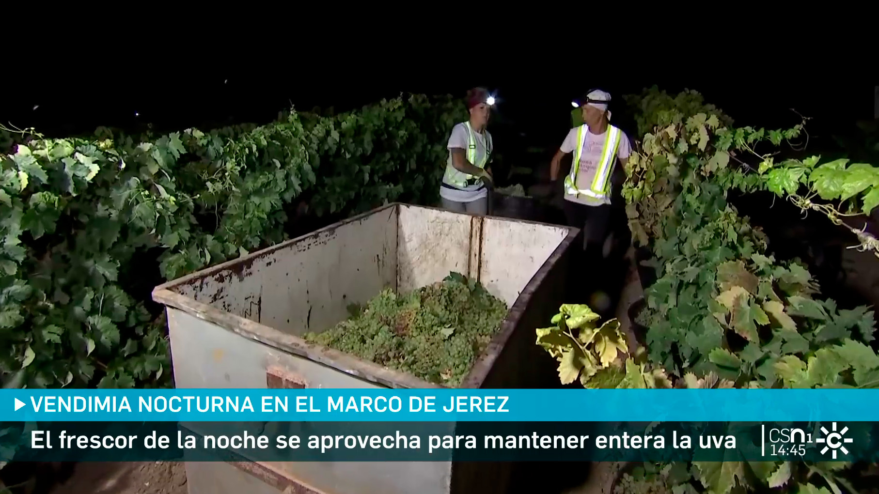 Un equipo de Canal Sur ha estado en una de las 1.500 fincas de la zona en la que se utiliza la vendimia nocturna. Cada productor decide la fecha de la recogida.