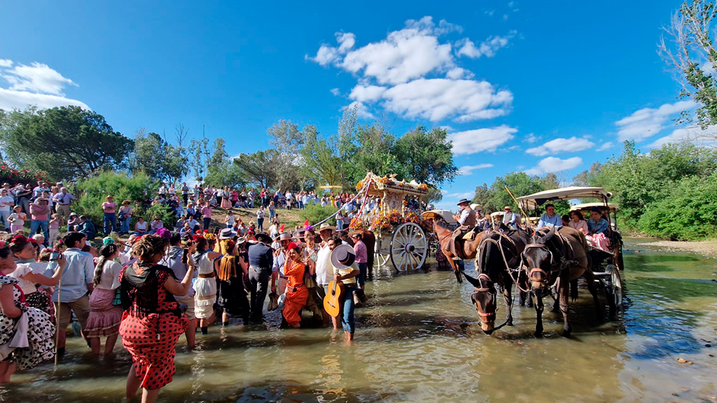 60 hermandades vadean el Guadiamar en ese punto, uno de los más icónicos de la romería de El Rocío. Las lluvias de este año han devuelto los tradicionales bautizos a los nuevos romeros.