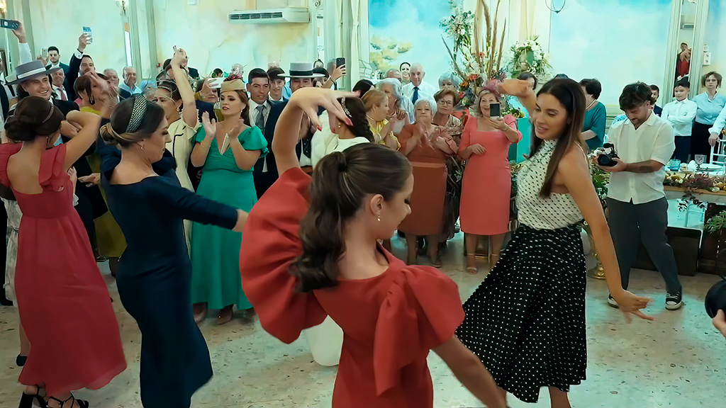 Isabel, la novia, ya le había advertido a Pilar Rubio que no la dejaría marchar de la boda sin bailar sevillanas. Y la presentadora se animó con el 'flashmob'.