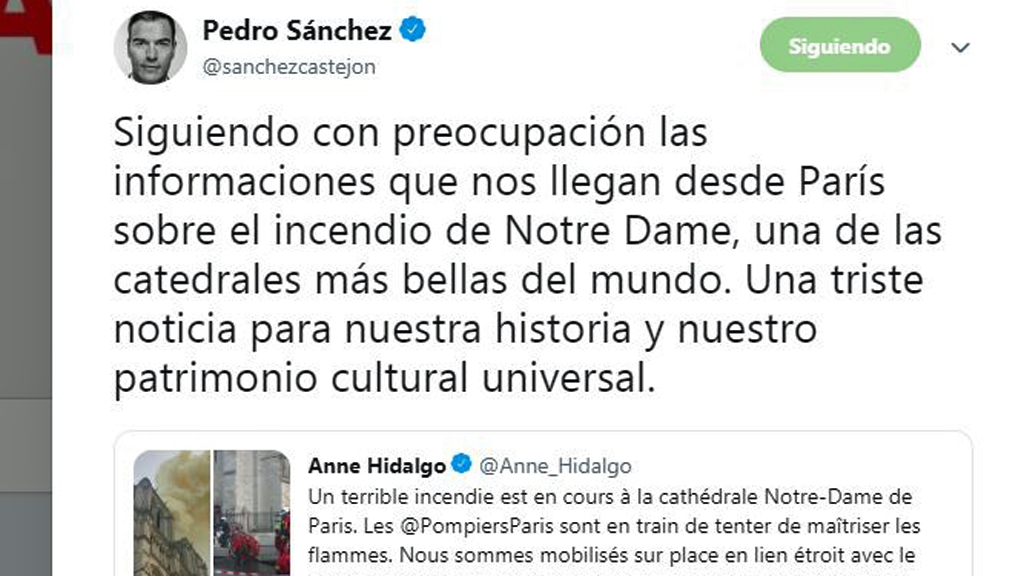 "Siguiendo con preocupación las informaciones que nos llegan desde París sobre el incendio de Notre Dame, una de las catedrales más bellas del mundo. Una triste noticia para nuestra historia y nuestro patrimonio cultura universal", ha escrito vía twitter el presidente español.