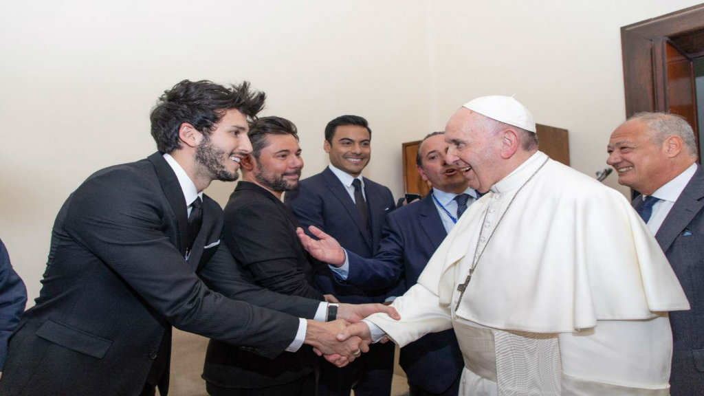 Aquí vemos a Sebastián Yatra saludando al Papa Francisco en compañía de otros artistas.
