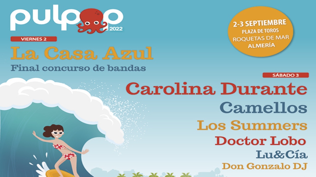 La Plaza de Toros de Roquetas de Mar (Almería) acogerá los días 2 y 3 de septiembre la décimo sexta edición del Pulpop Festival 2022. La organización acaba de anunciar el cartel definitivo confirmando la presencia de La Casa Azul y la final del concurso de bandas emergentes en la jornada del viernes, y los madrileños Carolina Durante, Camellos, Los Summers, Doctor Lobo, Lu&Cía y Don Gonzalo DJ qué actuarán la noche del sábado.