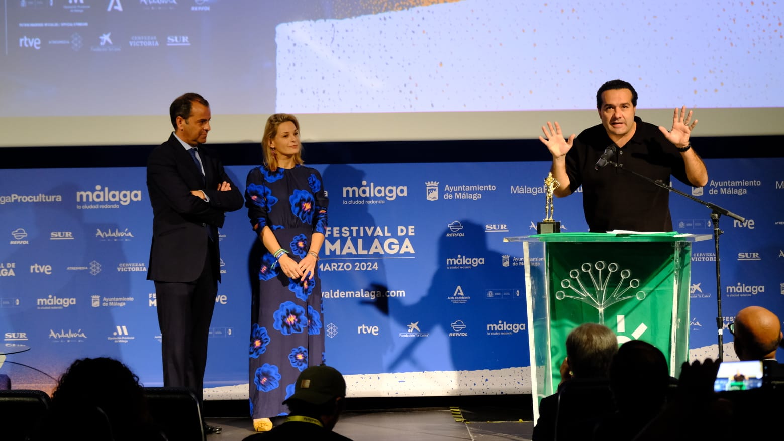 A la entrega del premio han asistido actores, productores, representantes de los medios de comunicación; el alcalde de Málaga, Francisco de la Torre; la delegada del Gobierno de la Junta de Andalucía en Málaga, Patricia Navarro; el vicepresidente 5º de Cultura de la Diputación Provincial malagueña, Manuel López; la delegada de Turismo, Cultura y Deporte, Gema del Corral; y el director del certamen malagueño, Juan Antonio Vigar.
