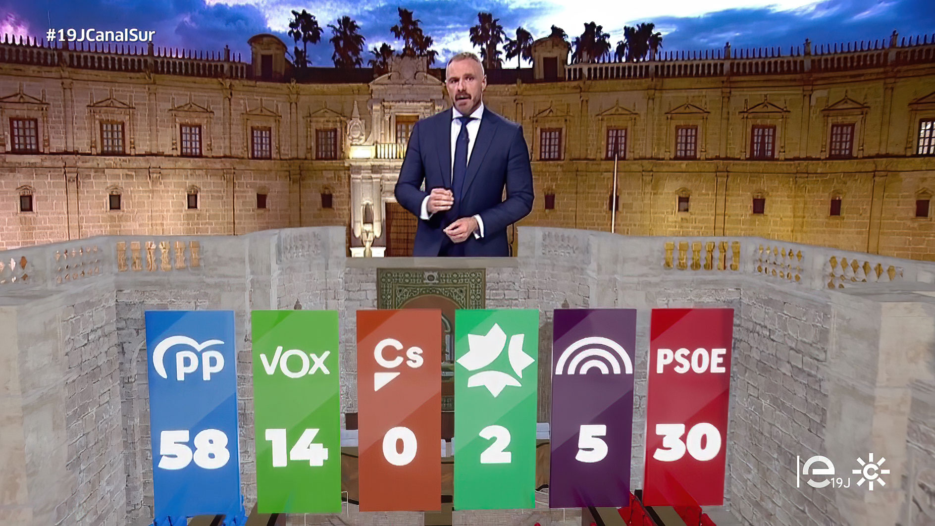 Para la estimación de los resultados electorales GAD3 realizó un sondeo para Canal Sur que se dio a conocer a las 20:00 horas y cuyos resultados coincidieron en buena medida con el escrutinio final. Los datos fueron presentados en pantalla con la llamada realidad aumentada, una novedosa técnica que muestra imágenes y datos en tres dimensiones para acercar al espectador a la información.