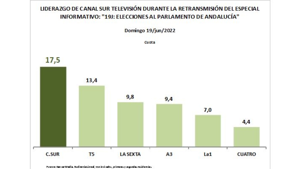 Los telespectadores andaluces eligieron el programa "Andalucía decide" ofrecido por Canal Sur para seguir la jornada electoral durante toda la tarde y noche del domingo 19 de junio. El programa especial alcanzó el 17,5% de cuota de pantalla y lideró en Andalucía la franja horaria de emisión entre las 19:15 horas y las 23:46 horas.