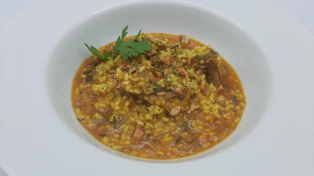 De menú, hoy toca arroz. Un arroz caldoso de costillas de cerdo con verduras y con algunos trucos. Uno de ellos, lleva un “majao” de almendras y azafrán que consigue que el plato quede muy meloso.