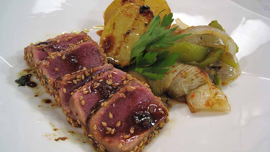 Para la escalivada lavar bien las verduras y disponer en una fuente de horno los pimientos, la berenjena, 4 dientes de ajo enteros y con piel, la cebolla pelada y cortada a la mitad, las patatas de guarnición cortadas a la mitad y los tomates sin pedúnculo y con un corte en forma de cruz en la base. Espolvorear con sal y echar un chorreón de virgen extra por encima. Llevar al horno precalentado a 185º durante 20 minutos. Para la marinada del atún dispondremos en un cuenco unas 6 cucharadas de aceite de oliva virgen extra, 1 diente de ajo y perejil picados, 4 cucharadas de salsa de soja, 1 cucharada de miel y el jugo de media naranja. Mezclar bien, y verter sobre las porciones de atún. Cubrir y guardar al frío. Sacar las verduras del horno y dejarlas reposar hasta que pierdan calor. Pelar y limpiar bien la verduras y cortarlas en tiras; a excepción de las patatas que cortaremos a la mitad. Disponer todas las verduras en un cuenco, aliñar con sal, pimienta, un chorrito de vinagre, un poquito de aceite de oliva virgen extra y perejil picado. Mezclar bien. Sacar el atún de la marinada, escurrirlo, secarlo y dorarlo en una sartén con un poco de aceite de oliva virgen extra; dejándolo en el punto de cocción deseado. Sacar de la sartén y rebozar levemente la superficie con un poco de ajonjolí. Servir las porciones de atún fileteadas junto con la escalivada. Aliñaremos con el mismo jugo que haya soltado la escalivada en el cuenco.