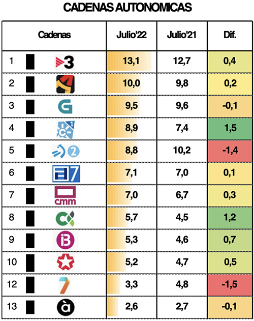 En relación con las autonómicas hay que reseñar, a parte de que es la que más crece sobre Julio de 2021, que supera a la televisión vasca ETB2 por primera vez desde Agosto de 2019.