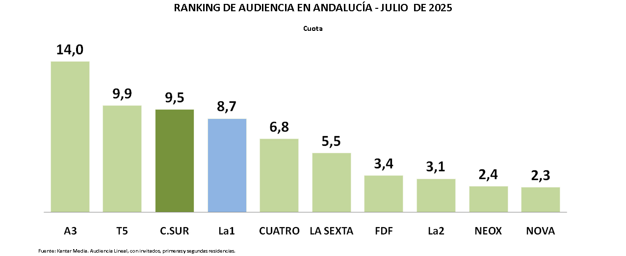 Los telespectadores de Andalucía premian y respaldan la programación de Canal Sur Televisión durante el mes de julio de 2025 con un 9,5% de cuota de pantalla. El canal público andaluz se afianza como uno de los referentes televisivos predilectos de los ciudadanos y ciudadanas de nuestra tierra al posicionarse como la tercera televisión con más audiencia de todas las que operan en nuestra comunidad autónoma por onceavo mes de manera ininterrumpida. Canal Sur Televisión se reafirma también, por noveno mes consecutivo, como la tercera televisión con mayor cuota de todas las televisiones públicas autonómicas.
