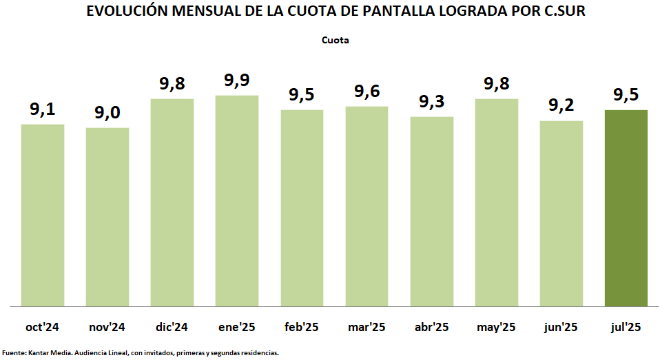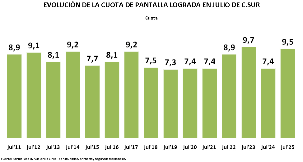 Este 9,5% de cuota de cuota de pantalla de julio establece su segunda mejor marca en un mes de julio en los últimos quince años, con un crecimiento de 2,1 puntos de cuota comparándolo con julio de 2024.