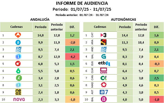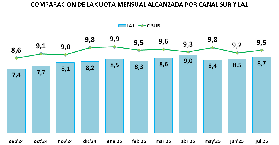 Canal Sur Televisión crece 3 décimas este mes en relación al mes de junio en un mes marcado por el campeonato de Europa de fútbol femenino. Desde octubre de 2024 el canal público andaluz supera la cota del 9% mensual, lo que pone de manifiesto la gran estabilidad y resiliencia de Canal Sur Televisión.