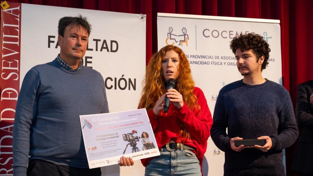 El director de Innovación, Negocio y Comunicación de la RTVA, Juan Vargas, ha entregado este jueves, 29 de enero, el Premio al Mejor Documental Audiovisual en el marco de la tercera edición de la ‘Jornada Discapacidad y Medios de Comunicación’, organizadas por COCEMFE Sevilla y por la Facultad de Comunicación de la Universidad de Sevilla. El trabajo seleccionado ha sido ‘Cuidadores, el trabajo invisible’.