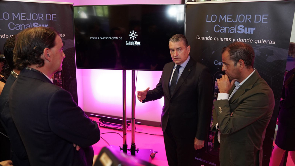 El consejero de la Presidencia ha conocido de primera mano, acompañado por el director general de la RTVA Juande Mellado y el director de Innovación y Negocio Juan Vargas, las últimas novedades que ha incorporado CanalSur Más, y ha navegado por la plataforma de contenidos bajo demanda en el stand que CSRTV tiene en las jornadas.