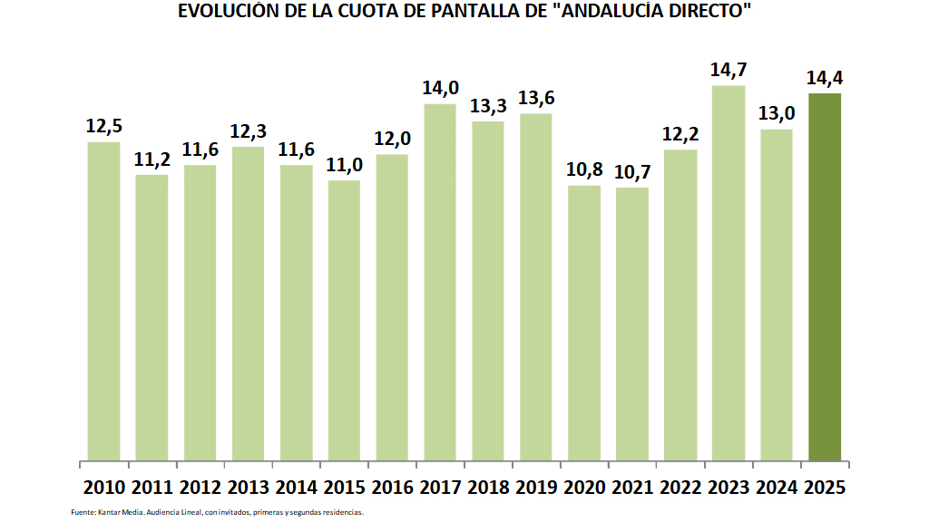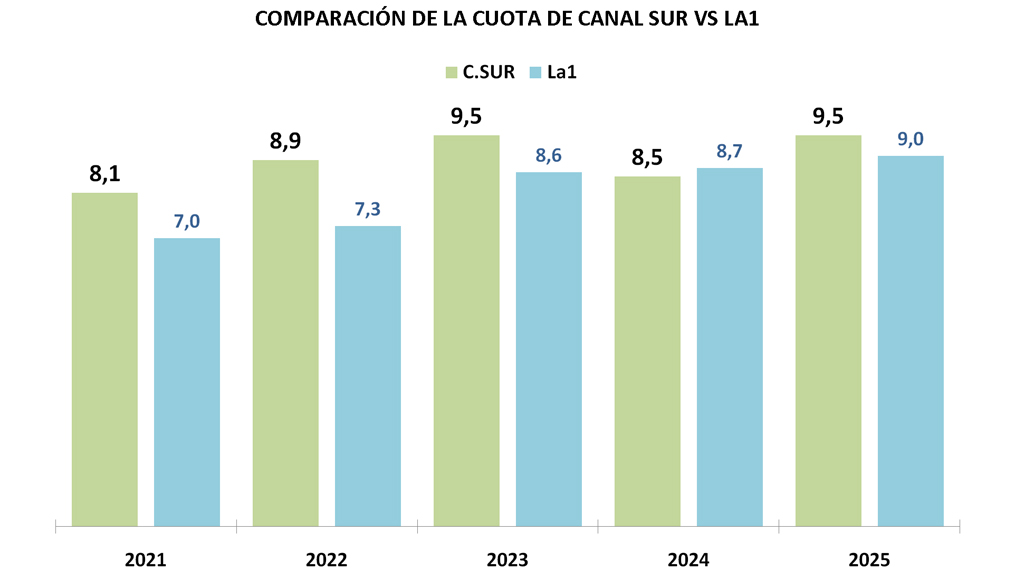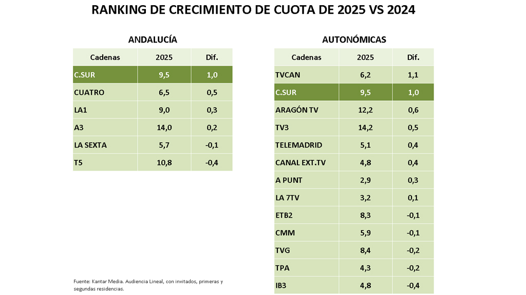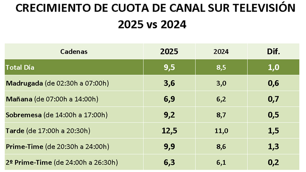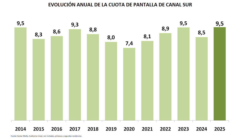 Canal Sur Televisión alcanza en el año 2025 una cuota del 9,5% e iguala su mejor audiencia anual de los últimos 12 años. La televisión pública de Andalucía experimenta también una subida anual de un punto en la cuota de pantalla, lo que proporciona acceder al tercer lugar en el ranking de cadenas tanto en Andalucía como entre las televisiones públicas autonómicas.